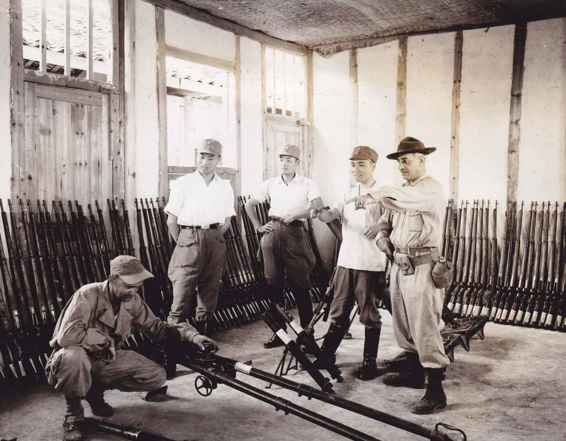 左起:隶属于美军在华作战司令部的新泽西州的安东尼·皮亚扎茨基参谋军士、刘上尉、唐少校、第四战区司令部的林上校、总部军医官威斯康星州的本杰明·伯克上校在一起查看中国军队在东部前线缴获的日军武器。