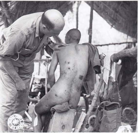 Casualty for115th Regt.Bullets penetrated this man's back making18separate wounds.He reached the first aid station24hours after wound was inflicted.In20hours his stretcher bearers will carry him to Papiaokai.