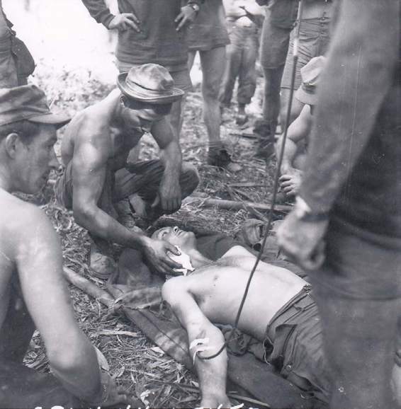 第475团第1营的来自德州肯特的哈罗德·艾维参谋军士在接受输血,他的颈部因为卡宾枪意外走火而受伤。这起意外发生在第475团第1营往缅甸八莫行军的路上。八莫公路近莫勒河段(音译)。