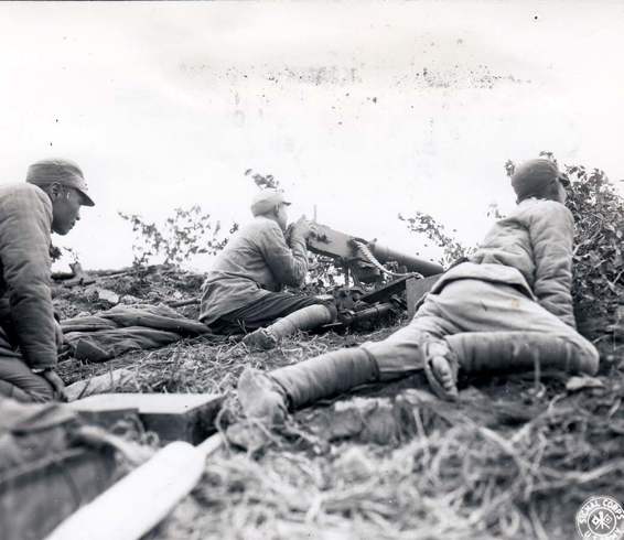 图为第19师57团机枪手在芷江保卫战中的战斗场景。他所在的位置在中国江口以南一英里。