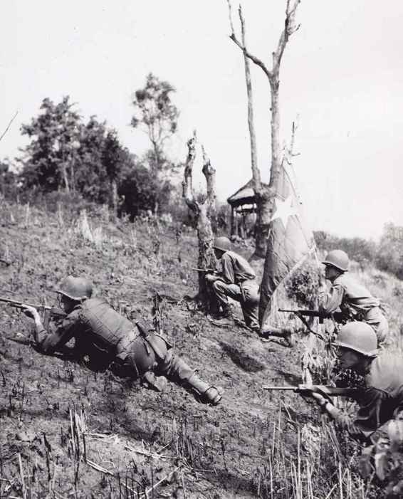 Sgt.Richard Hatfield,carries the Lone Star Flag in attack in reenactment of the advance up"Knight's Hill".Lashio,Burma.