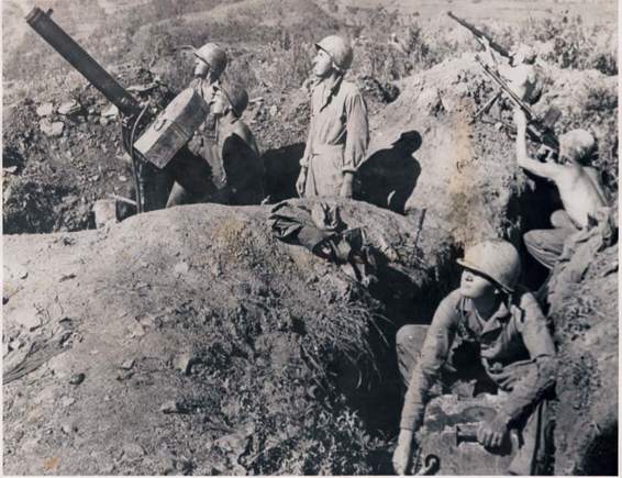 Troops of the U.S.Y-Force Operations Staff open fire on aJapanese plane from slit trenches on ahillside on the Salween River front in southwestern China.The Y-Force is participating with Chinese forces that on Sept.15th1944,forms ajunction with U.S.General Joseph W.Stilwell's troops driving from Burma.Ledo and Burma roads,followed the liberation by Chinese forces on Sept.14,of Tengchung,the first large Chinese city to be forced of Japanese rule in more than seven years of war.