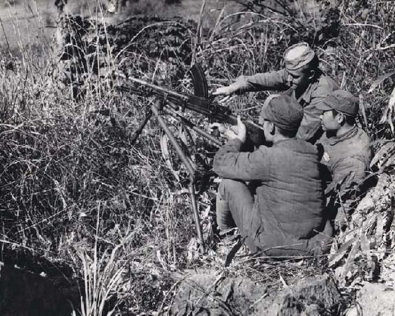 来自麻省威尔的罗伯特·奥德雷德参谋军士在一个山丘工事上指导中国士兵使用布伦式轻机枪。
