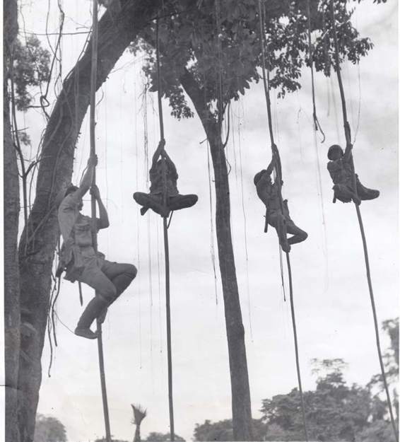 High into the trees wriggle these American-Trained Chinese Jungle Fighters who will lookout posts in the China,Burma,India,War Theater.They are all ready to battle on any terrain after ayear of intensified training in Jungle warfare at the U.S.Army school for Chinese Fighters.