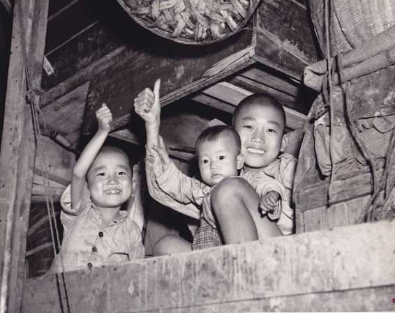 Typical of the indomitable Chinese spirit,these young children,unmindful of all give the cocky"Ding Hao"for the Cameraman.