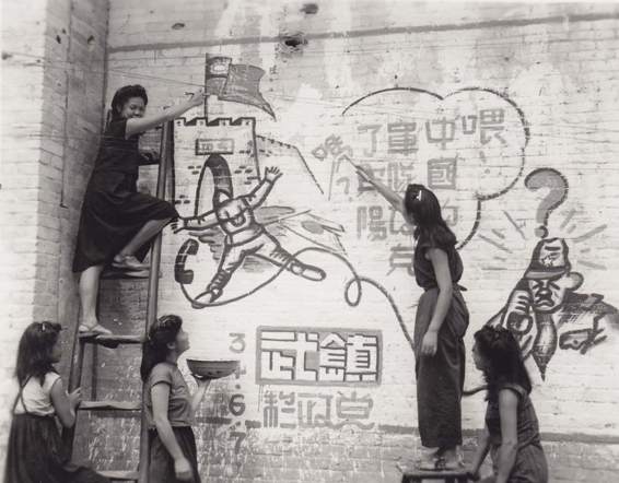 As cities and villages of South China were evacuated by withdrawing Japanese forces,propagandist teams of artists appeared and began telling the story of the broken GEA lifeline on walls of bullet pocked buildings.These teams are made up of young men and girls.They follow the advancing Chinese armies closely give lectures to the troops and villagers and tell in pictures the story of China's victories.They also act as news propagandists.