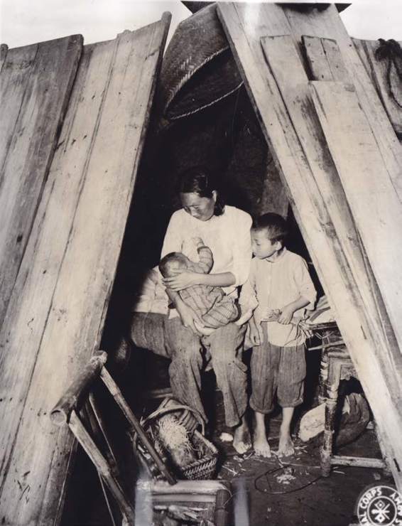 一位洪灾的幸存者在小小的木头避难所下避雨,并哺育她的孩子。巫水河的两岸在两周的暴雨后被淹没。在通往芷江和中国东部的公路387公里处的洪江,许多村民失去了他们的房屋。巫水河上涨了20尺,淹没了洪江桥堤防,断绝了中国东部芷江战场的补给线。