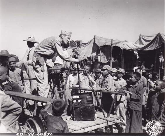 来自新泽西州亚特兰大的包尔马斯一等兵正在努力拍摄千万人群逃离日本军队撤离柳州,经广西铁路前往桂林的影片。当地人正好奇地看着他。