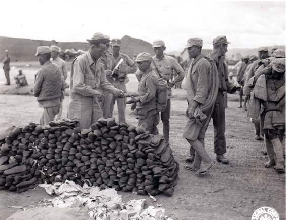 佛罗里达州的莫斯·戴维斯二等兵给中国军队第5军的士兵们发放胶底鞋。部队即将从云南驿机场出发前往保山。