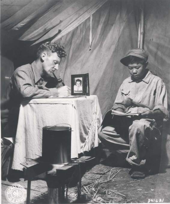 在他位于怒江前线某个小帐篷的“家”中,加州洛杉矶的通信兵摄影师乔治·寇科瑞克技术军士正在给美国的亲人写信;名叫“明克”的中国小战士在一旁阅读杂志。