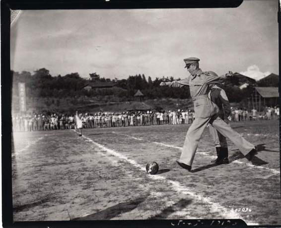 在重庆,中国战区美军总司令魏德迈中将为一场中国对美、英联队的足球友谊赛开球。球赛由重庆警察部队举办,旨在为中国伤兵筹款。