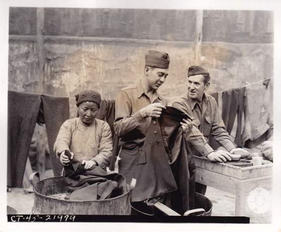 密歇根州的拉维恩·巴恩斯中士和俄亥俄州的哈里·莫尔曼中士在后勤补给运输部负责军装干洗工作。
