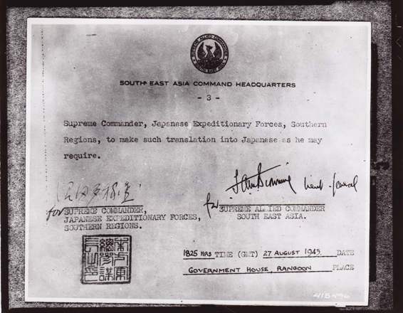 The signatures on the agreement,of Lt.Gen.F.A.M.Browning,Chief of Staff South East Asia Command,for the Allies and Lt.Gen.Takazo Numata for the Japanese.The agreement was signed in the throne room of Government House.