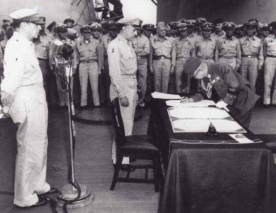 在东京湾美国海军密苏里号战列舰的投降仪式上,梅津美治郎将军代表日本帝国大本营签字。左为道格拉斯·麦克阿瑟将军。中间为麦克阿瑟将军的参谋长理查德·萨瑟兰中将。