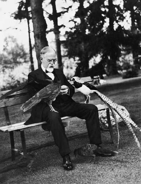 向福格艺术博物馆捐赠玉器和青铜器的格伦威尔·温思罗普。图为他在马萨诸塞州伦诺克斯市格罗顿镇的自家花园与鸟类朋友在一起。Imaging Department© President and Fellows of Harvard College