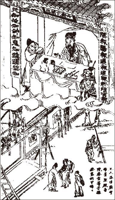 成于19世纪的《玉历至宝钞》所绘的地狱第六殿,此书兼蓄民间传说与佛道色彩,劝人去恶向善,在洪秀全年轻时流行于华南。洪秀全改信基督之后,认为这些书都应予以销毁。由左图可见六殿卞城王坐在桌前,一副对联分贴两旁,上联曰:“阴报阳报迟报速报终须有报”,下联曰:“天知地知你知我知非谓无知”,横匾上书:“六殿卞城王”。卞城王右有一人做文人打扮,将亡魂在凡间的行为择要报告,左有一鬼吏监看刑罚。