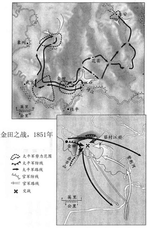 这人间天堂到底在哪里,还是听不出来。不过因为要朝东北突围,所以还是有个大致方向可循。就军事角度来看,突围极为成功:动作迅速,纪律严明,相互协调,官军相形见绌。但突围也很无情,拜上帝会教徒准备离开时,须将房舍烧掉,以证明他们对太平天国的忠心。因为每个村庄都得放弃,村落和附近山丘可食之物都被搜刮一空,以备征程所需38。太平军前锋由萧朝贵和石达开率领,水军则由罗大纲领军,逆骥江而上,直扑距紫荆山东北方约六十英里的永安城。官军弄不清太平军突围是取哪条路线,兵分两路追击,一路偏西,一路偏东,结果都没拦住太平军。洪秀全及其家眷在杨秀清中路大军的护卫下,尾随水军先遣部队进发。殿后掩护大队人马的艰巨任务,则由冯云山和韦昌辉负责。
