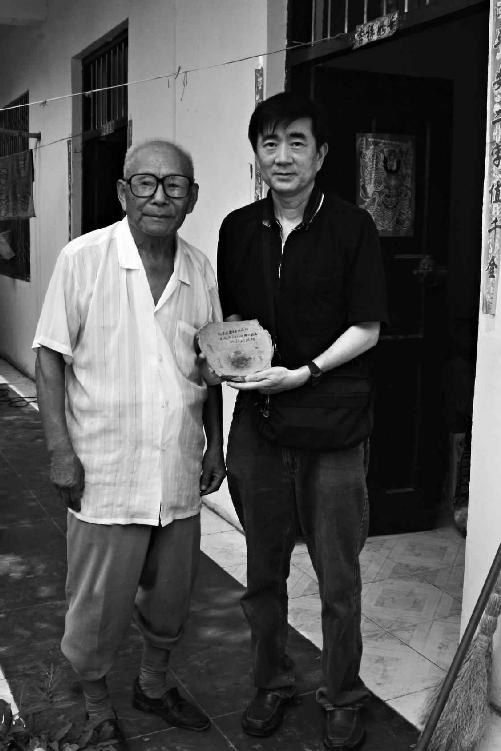 与杨凤翔先生打听到当年参与调查的杨凤翔先生还健在,当即前往拜望。杨先生七十有余,退休在家,喜迎我等远道的好古同行。一席话下来,喜出望外,杨先生就是当年陶片的采集人,采集到的四件陶片,有一件还保存在杨先生手边,欣然展示与我们。