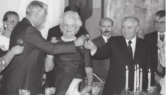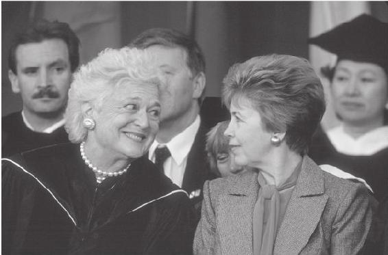 芭芭拉·布什和赖莎·戈尔巴乔夫在莫斯科有她们自己的日程。两位第一夫人相处得格外融洽。1990年6月,在戈尔巴乔夫访美期间,她们曾共同参加了卫斯理学院(卫斯理,马萨诸塞州)的毕业典礼。(科比斯图片社)