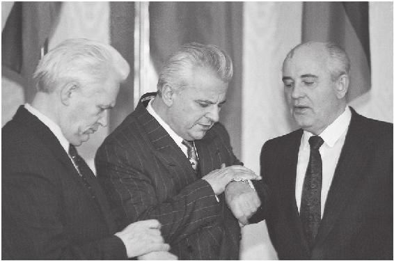 时间到了。俄罗斯总理伊万·西拉耶夫和日后的乌克兰总统列昂尼德·克拉夫丘克正在对时间,而焦虑的米哈伊尔·戈尔巴乔夫在一旁看着他们。1991年秋,戈尔巴乔夫发现和苏联这两个最大的加盟共和国打交道愈发困难。1991年,莫斯科,克里姆林宫。(俄通社-塔斯社图片通讯社)