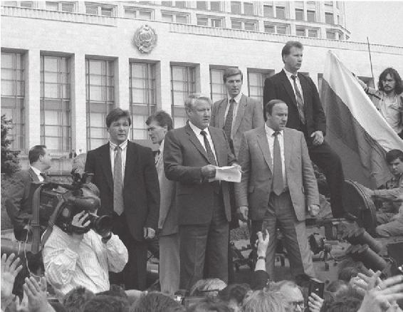 反抗者鲍里斯·叶利钦登上了坦克,宣布政变是违宪的。布什总统起初不愿意支持叶利钦,但是由于戈尔巴乔夫已经被政变者拘禁,所以他除了支持叶利钦外别无选择。叶利钦的警卫长亚历山大·科尔扎科夫在其右侧。1991年8月19日,莫斯科。(科比斯图片社)