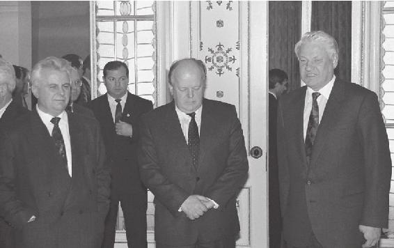 斯拉夫国家三合为一。1991年12月8日,在别洛韦日的狩猎屋中,三位斯拉夫共和国领导人决定解散苏联。从左至右依次是:心满意足的乌克兰领导人列昂尼德·克拉夫丘克,困惑为难的白俄罗斯领导人斯坦尼斯拉夫·舒什克维奇,以及一直以来的关键人物俄罗斯总统叶利钦。他正在为第二天早上在莫斯科和戈尔巴乔夫的一场激烈会谈做准备。(俄通社-塔斯社图片通讯社)