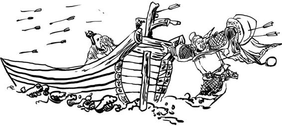 身边的许褚心急火燎,也不管曹操同意不同意,架起曹操就奔往河边的渡船上。刚刚才爬上船,马超骑兵已经赶到岸边,箭如雨下。许褚连忙举起硬质马鞍,为曹操遮挡利箭……