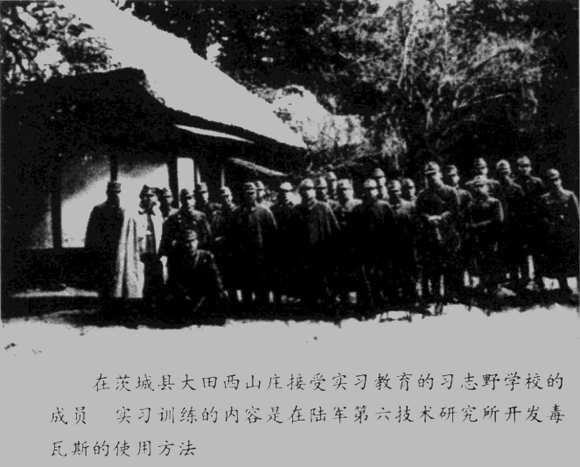 除了这个研究化学武器的陆军第六技术研究所之外,还有一个千叶习志野学校。它属于另一指挥系统,归陆军教育总监领导。这个学校在各连队分别配属一二名负责毒气工作的军官,他们是负责开展连队毒气战防护方法、防毒面具及衣服的穿着训练和消毒等教育的专门技术军官。习志野学校从全国各地和海外驻地召集这些军官进行六个月至一年的毒气防护及攻击方法的训练。