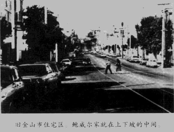 鲍威尔的家,坐落在教会大街坡道的中间,是一幢刷了白粉的二层木结构楼房。一层是个有大橱窗的店铺,玻璃窗上写着“鲍威尔商店”几个金色大字。橱窗里摆了些旧的陶制茶壶、用藤编织的椅子、鸟的羽毛、大小不一的发光的金属管制成的旧式西服衣架等,毫不在意零乱地摆放着,是一家旧货商店。