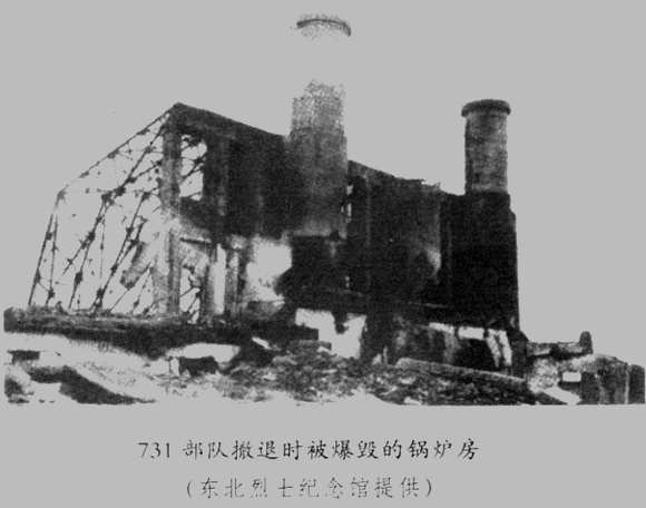1945年8月9日,部队开始撤退时,为了销毁大量罪证,三根烟囱全部开动起来。据原动力班人员的记忆,“各研究班连日来把大量的资料运来,从8月9日到13日,在炸毁锅炉房之前,一直忙着烧毁这些东西”。据说在烧毁的资料中,有许多“马鲁太”的X光透视片。