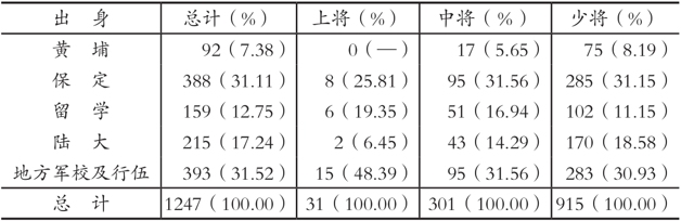 第一,战前陆军的将官出身黄埔者极少,且出身黄埔的比例乃是随着阶级高低成反比。至1947年,将官出身黄埔者已有显著增加,其比例也是随着阶级的高低而成反比,少将出身黄埔者已占多数(出身陆大及外国军校者,也多系黄埔毕业)。