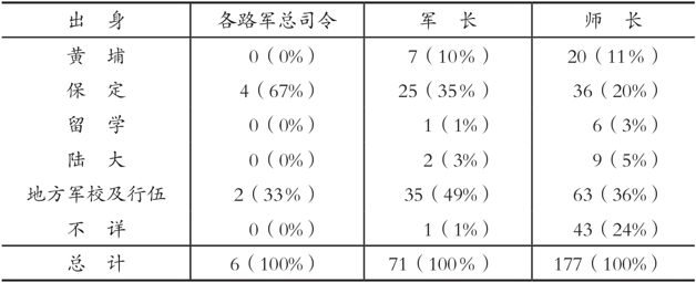 以上系抗战时期将官出身背景的一般趋势。以下拟再就陆军重要军职人员(战前的各路军总司令、军长、师长和战时的战区正副司令长官,集团军正副长官、军长、师长)的出身背景加以分析。