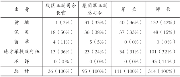 资料来源:Hsi-sheng Ch’i,Nationalist China at War: Military Defeats and Political Collapse, 19371945, Ann Arbor:University of Michigan Press,1982,p.230. 作者所根据的资料为《陆军军官佐资绩簿》(1944),其中军、师长无一人系留学归国者,统计数字疑有误。