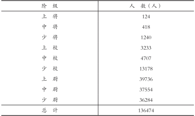 表1-5、1-6共收录上将以下,直至少尉的统计数字,报告中注明各项数字“均系出自一位军政部官员的估计。在这方面,官方从未公布过数字,因此这些数字虽然不可靠,但是在没有更好的数字以前,仍有参考的价值”[37]。不过,由于所列各级军官总数(136 474),与“国防部”史政编译局《抗日战史》一书所称“官佐共一十三万六千余员”[38]几乎完全吻合,因此本项资料的正确性,应是相当的高。此外,根据表1-5的数字,将官总人数仅占所有军官人数的1.3%,因此表1-6数字大致也可以反映中、下级军官的状况。