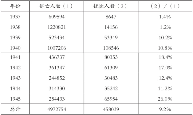 表2-6显示,抗战初期的战况最为激烈,伤亡人数最多,但是抚恤人数最少,显示抚恤工作形同虚设。1938年8月,抚恤委员会成立后,抚恤业务逐渐成长,至1945年时,已有四分之一强的伤亡人数获得抚恤,但是从整体来看,抚恤的范围仍未普及,抗战八年期间伤亡者中获得抚恤的比例,尚不到10%。究其原因,大致可分为以下几项。