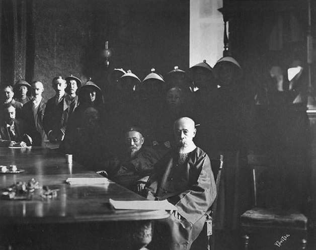 1900年(光绪二十六年)6月12日,为收拾八国联军的战争残局,清廷再度授李鸿章为直隶总督兼北洋大臣,并连续电催其北上。李鸿章乘轮船至上海后,以身体不适为由暂停观望,部下及亲属也都劝其以马关为前车之鉴,不要再北上,以免又成为替罪羊。直至7月30日,北京局面实在无法收拾,慈禧在逃亡途中急催李鸿章北上。一个月后,李鸿章抵京收拾残局,向八国联军求和。1901年9月7日,李鸿章、奕劻代表清廷签署了《辛丑条约》,赔款四亿五千万两,人均一两,以示侮辱。