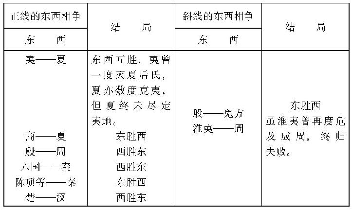 据此表,三代中东胜西之较少,西胜东之事甚多。胜负所系,不在一端,或由文化力,或由战斗力,或由组织力。大体说来,东方经济好,所以文化优。西方地利好,所以武力优。在西方一大区兼有巴蜀与陇西之时,经济上有了天府,武力上有了天骄,是不易当的。然而东方的经济人文,虽武力太失败,政治上一时不能抬头,一经多年安定之后,却是会再起来的。自春秋至王莽时,最上层的文化只有一个重心,这一个重心便是齐鲁。这些话虽在大体上是秦汉的局面,然也颇可以反映三代的事。