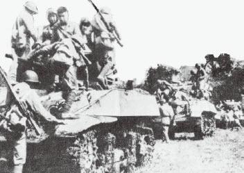 坚布山战斗中,中国步兵乘车前进,一方面可以获得战车的掩护,一方面也可以帮助视野不良的战车提前发现来袭的日军。
