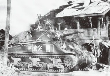 斯蒂威检看了日军被击毁的战车,取了一面日军的膏药旗,带回去作了纪念品——美国人没有“膏药”的概念,他们把这种旗帜叫做“肉丸子旗”。他的印象是日本坦克无论重量还是防御,连M3A3的水平都达不到。这的确是事实,在各国主力战车中,日军的95式轻型坦克的确属于袖珍体型的,加上弹药和人员也只有7.7吨重。虽然这种坦克在中国战场曾给装备低劣的中国步兵部队造成很大威胁,但在缅甸的战斗中,不但远征军的坦克它打不过,连卡车也可以“欺负”它。1944年12月,远征军的卡车驾驶员邓中华就曾经用美制道奇大卡车撞翻了一辆袭击运输部队的日军95式坦克,创造了战争史上的奇迹。