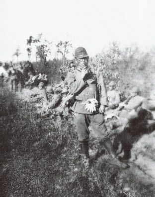 攻占抗联密营的日军部队,画面下方可以看到一名被覆盖着的日军尸体,他是在冲向密营大门时,被出来抵抗的抗联战士击中毙命的。