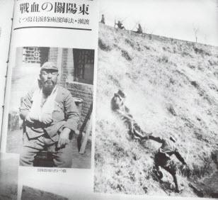在庐山攻坚战中,被击伤的日本记者右为同一场战斗中日军一名军官拖曳被击伤的同伴逃离战线。