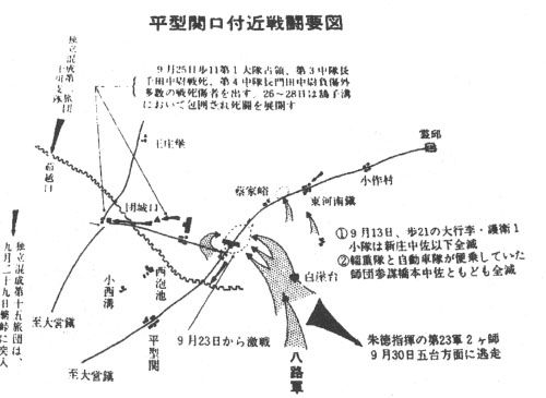 从下图可见,此战日军与国民党军和共产党军同时交战。不过,图中标明和国民党军交战中日军阵亡最高的军官仅为中尉(与国民党军的战斗也是颇为激烈的,第十一联队战史中记载第一大队长尾家剑就差一点因为全军覆没而引罪自杀)。所以,八路军在“平型关大捷”,即图中在蔡家峪和平型关之间描述的战斗中,击毙日军两个中佐的伏击战战果显然对国共两军都是很重要的。