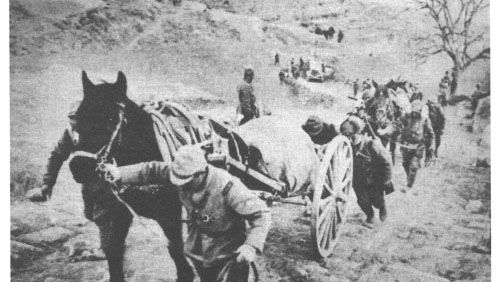 这张图本身并无特别,但书中对于此照片的一段说明引起了我的注意一一“昭和十二年九月,粟饭原部队大行李从灵丘出发,满目沧桑的北支大行山脉(应为太行—译者注),艰难的行军,同期小仓中尉也在其中,于是留影纪念,不料却成永别。”