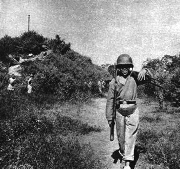 仔细看这张照片,会发现这位笑得很灿烂的中国远征军战士腰上围的竟是一面日本太阳旗。