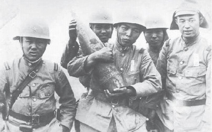 怀抱苏军打来的重型炮弹合影留念。可是,抱什么耍酷不好,你抱敌人打来的重型炮弹?看来是苦头还吃得不够多。