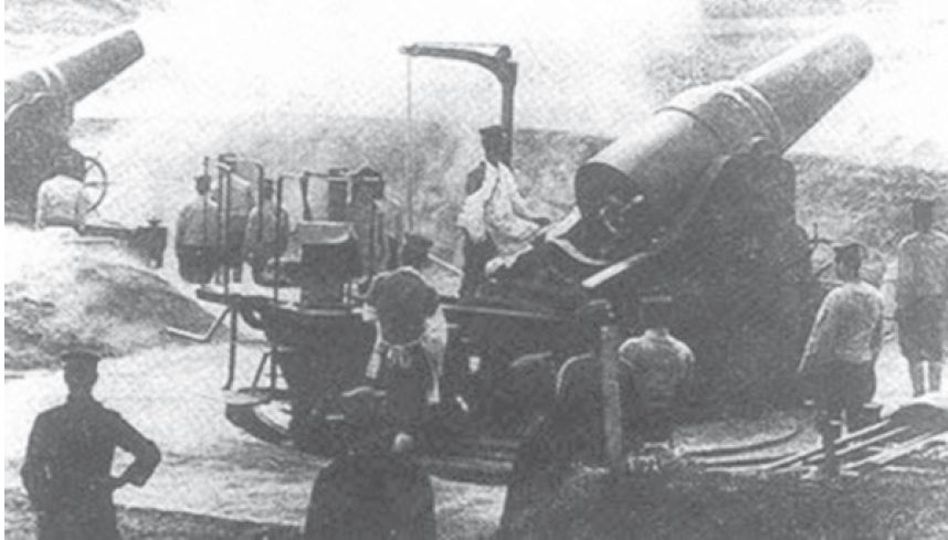日俄战争中,日军用重型榴弹炮轰击旅顺港内的俄军战舰。