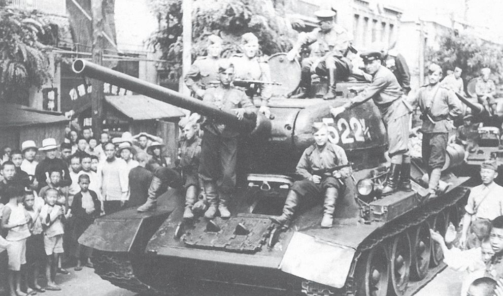 在迅速打垮抵抗的关东军之后,苏联红军的坦克出现在中国东北的大街小巷。
