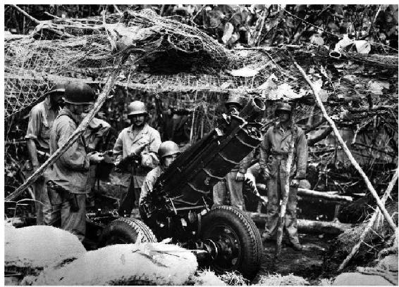美军陆战队在瓜岛上使用的M-1型75毫米榴弹炮。它是美军在太平洋战争中常用的近距离支援武器,无论陆军还是海军陆战队都有装备。相对于较为笨重的大口径榴弹炮,75炮具有小巧灵活的特点,更能适应地形复杂的岛屿战斗,同时威力又要强过迫击炮,若用于拔除一般的火力点不在话下,其炮弹甚至能将岛上巨大的岩石击成粉末