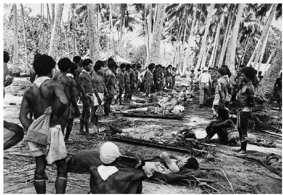 在新几内亚,土著居民不仅帮助美军收集飞机零件,还给他们抬运伤员