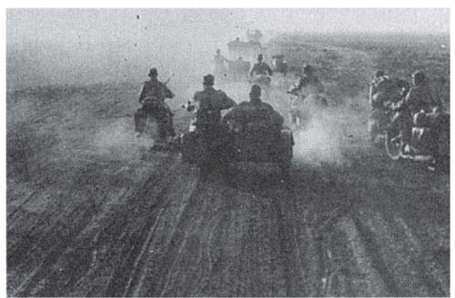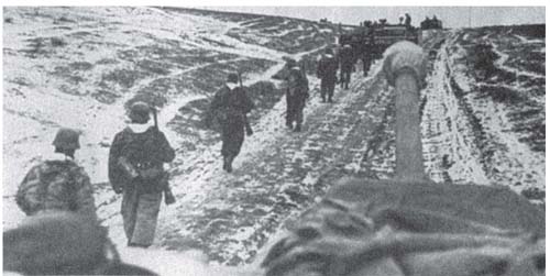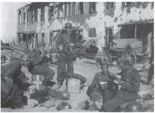 一群德军补充兵穿过被占领的俄国城镇,赶往他们要加入的部队。